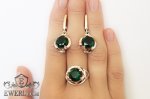 Женский комплект: серебряное кольцо и серёжки с зелёными фианитами