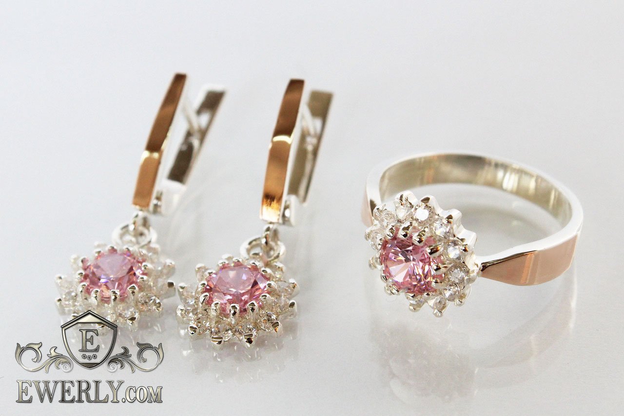 Женский комплект: серебряное кольцо и серьги с розовыми камнями