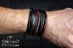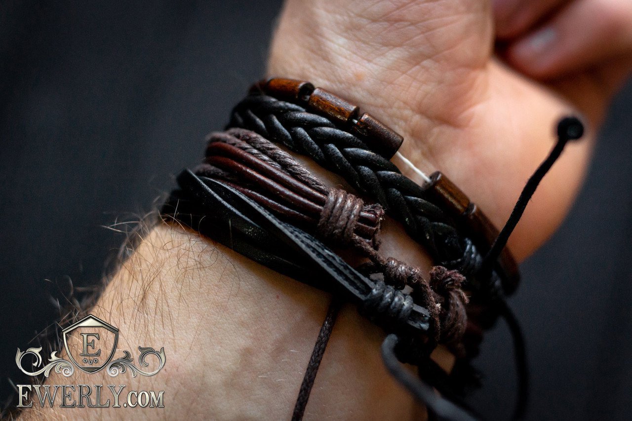 - Три кожаных браслета с регулировкой на шнурке и один деревянный браслет.