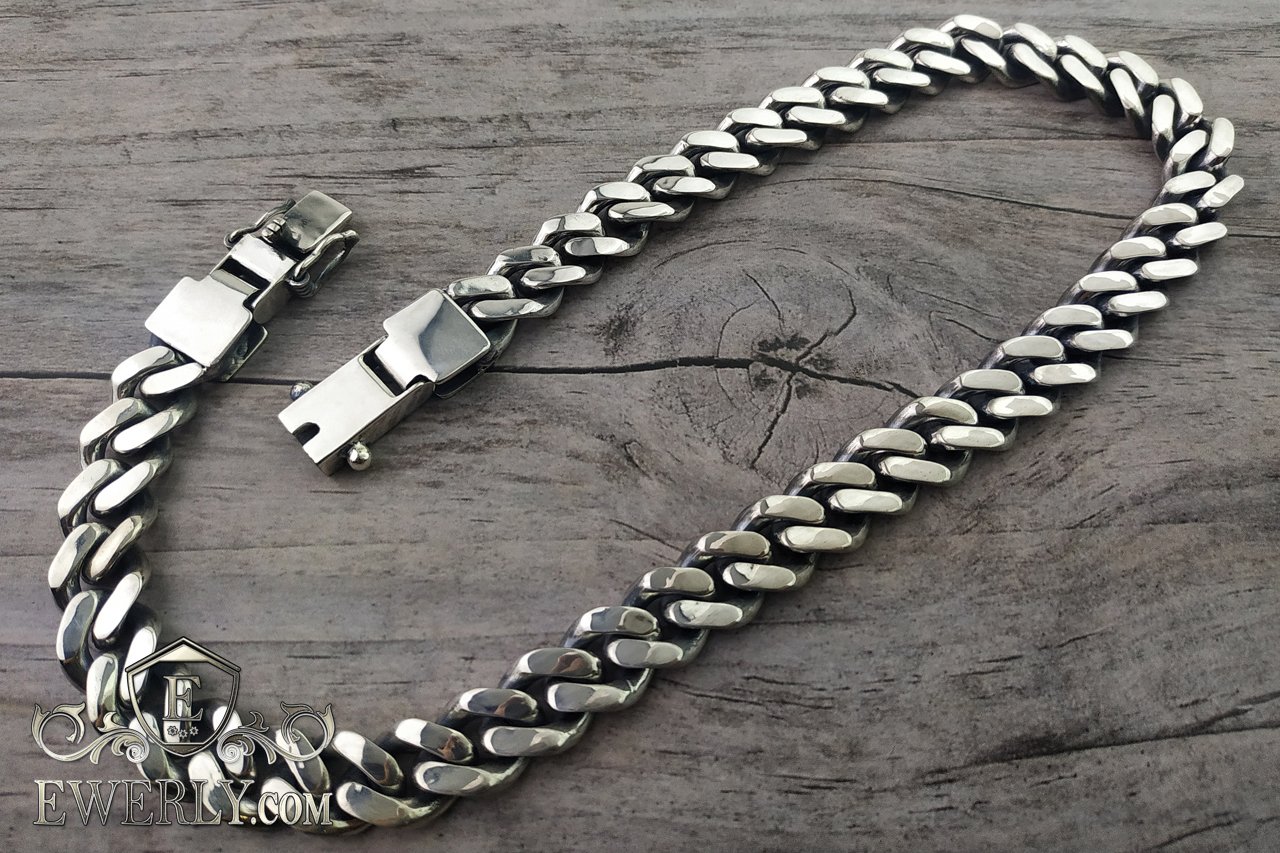 Полновесная цепочка.На текущей странице изображена массивная мужская серебряная цепь Панцирь с замком "Коробочка" массой 215 грамм и длиной 50 см. Изготовлена она посредством литья по заранее заготовленной модели, поэтому без дополнительного моделирования размер её звеньев изменить нельзя. Высота звеньев 4.5 мм.
