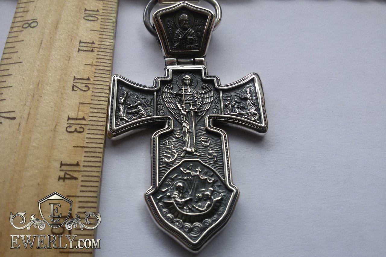 Властью над морской стихией Бог наделяет и избранных Им угодников. Один из них — свт. Николай Мирликийский (III в.). За удивительную (еще прижизненную) силу, способную укрощать стихию, в народе его называют также «Николой Морским». Образ Николая Чудотворца венчает оборот креста. В нижней же части изображено его известное чудо спасения в бурю корабля. Погибающие моряки никогда не видели епископа города Миры, но слышали о его чудесной помощи. Они молитвенно воззвали к святителю, и он неожиданно появился на корме у руля и благополучно привел корабль в гавань.