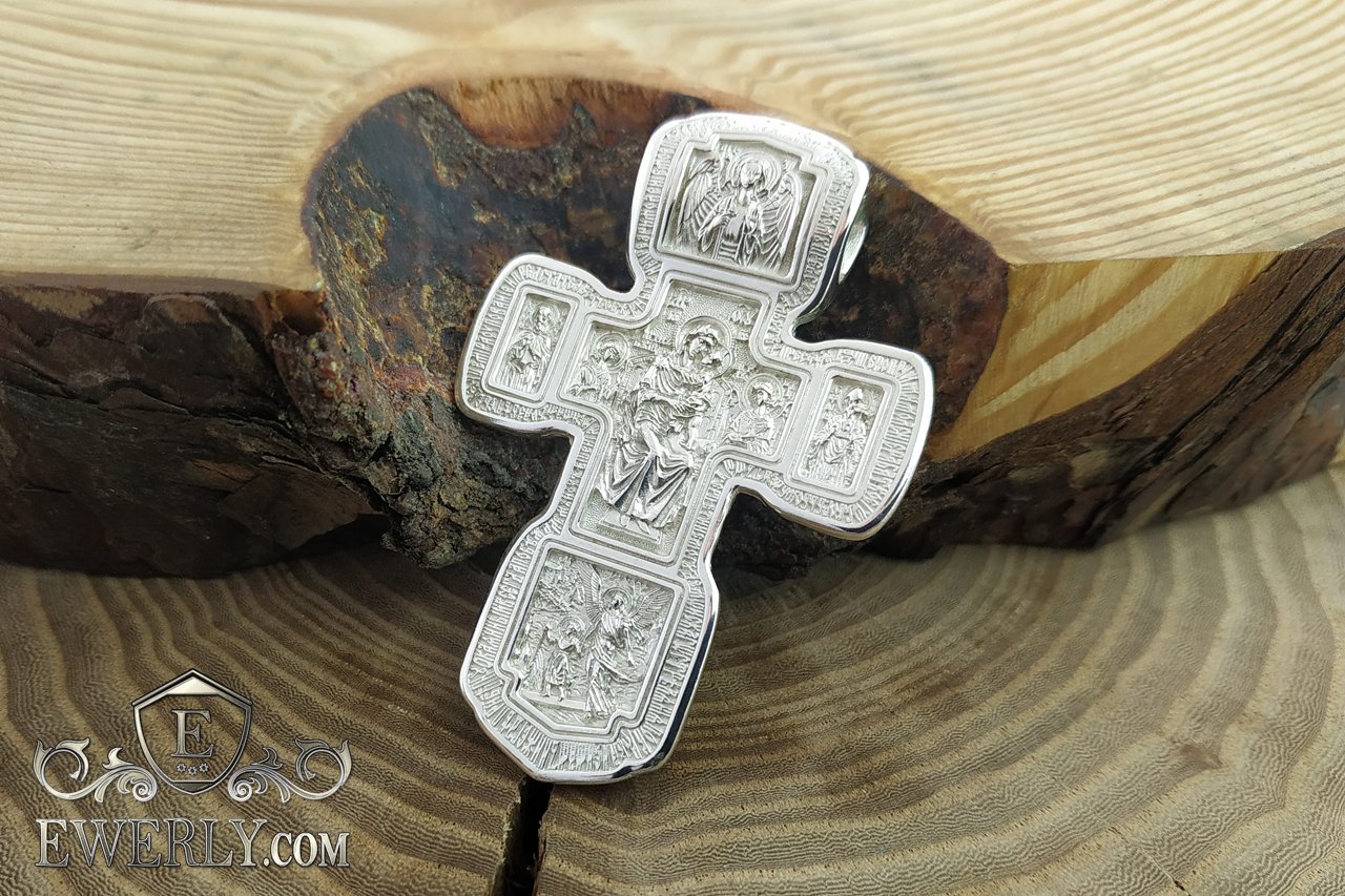 Вокруг Распятого Спасителя на кресте расположены иконы наиболее почитаемых на Руси святых, небесных помощников в самых разных нуждах, духовных и семейных проблемах.