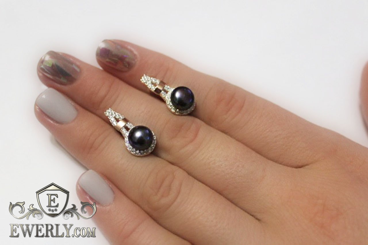 Серебряные серьги с камнями с чёрными фианитами в виде жемчуга