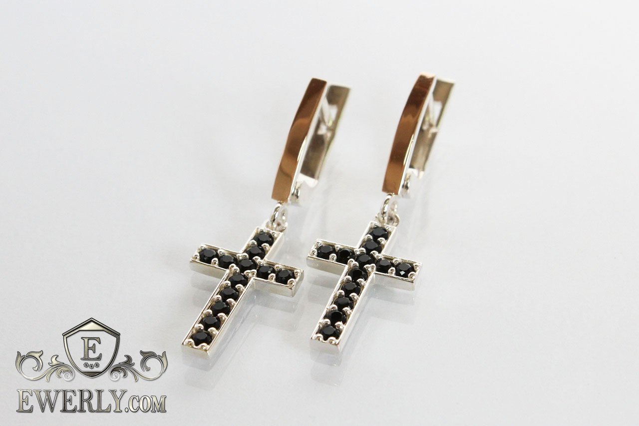 Жіночі срібні сережки - хрести зі срібла з золотом (чорні камені)